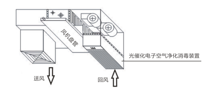 光催化电子空气净化消毒装置由多个净化??樽槌?,含光子初效过滤模块、高压静电??椤⑻匦晕侥?椋浜诵哪?槭歉哐咕驳缒??,高压静电模块为特殊设计的双极平板百叶式,具有放电区和集尘区两个分区,相对传统的静电过滤网或蜂窝式电子空气净化器的净化效率最高。其主要原理是利用静电吸附颗粒物和吸附了细菌微生物的气溶胶,并击穿杀死通过电场的细菌和病毒,可安装于风口、风道,也可安装于空调箱内替代中效过滤器作为独立的净化功能段而使用。